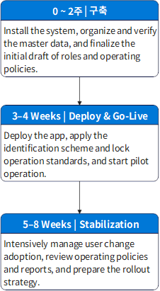In the end, success depends less on technology and more on user change management across both direct employees and contractors, including roles, approval rules, and work habits. In general, Smart ILS recommends 3 to 6 weeks of focused operation and field support, followed by standardization of master data, operating policy, and authorization structure, and then phased expansion across the site.