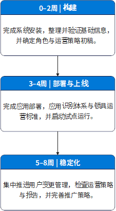 一般建议先进行 3 至 6 周的集中运行和现场陪同验证,之后再将基础信息、运行策略和权限体系标准化,并分阶段推广到整个现场。